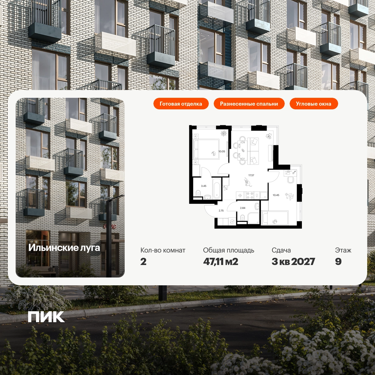 Продаётся 2-комн.квартира площадью 47.11 кв.м на 9 этаже 9 этажного дома (Корпус 4.2, секция 1) проекта ПИК Ильинские луга. Светлый просторный подъезд на уровне земли, функциональная планировка, большие окна, с отделкой. Жилой район «Ильинские луга» находится в 10 километрах от МКАД по Новорижскому шоссе, в 20 минутах на автомобиле от станций метро «Волоколамская», «Тушинская» и «Строгино». В будущем ближе к проекту, в 9 минутах пути на машине, откроется станция «Ильинская» Рублёво-Архангельской линии, которая будет соединять Арбатско-Покровскую линию и Большую кольцевую линию. «Ильинские луга» — масштабный проект, в который входит девять детских садов, четыре школы и поликлиника. Он строится в престижном и экологичном районе среди лесов и памятников природы. За 5 минут от жилого квартала можно доехать до Рублёво-Успенского шоссе, а за 30 минут — до центра Москвы. До крупного торгового центра «РИГАМОЛЛ» всего 5 минут на автомобиле, а до ТЦ «Твой дом» и гипермаркета «Глобус» — 10 минут. В «Ильинских лугах» строятся только девятиэтажные дома — такая архитектура соответствует спокойной жизни за городом. В каждом дворе-парке есть места для отдыха, детские и спортивные площадки. А ещё, здесь уже открыт большой PlayHub «Гравити» — современное игровое пространство с космической тематикой, холмами, зонами для игр и отдыха жителей любого возраста. На первых этажах уже работают магазины, кафе и пекарни. Места для отдыха от «Ильинских лугов» тоже недалеко: 10 минут на машине — и вы в музее-усадьбе «Архангельское». Также рядом находится Лохин остров — памятник природы, где водятся речные черепахи, есть места для кемпинга и возможность сплавиться по реке. Артикул - 1015381О застройщике