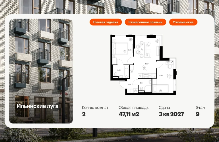 Продаётся 2-комн.квартира площадью 47.11 кв.м на 9 этаже 9 этажного дома (Корпус 4.2, секция 1) проекта ПИК Ильинские луга. Светлый просторный подъезд на уровне земли, функциональная планировка, большие окна, с отделкой. Жилой район «Ильинские луга» находится в 10 километрах от МКАД по Новорижскому шоссе, в 20 минутах на автомобиле от станций метро «Волоколамская», «Тушинская» и «Строгино». В будущем ближе к проекту, в 9 минутах пути на машине, откроется станция «Ильинская» Рублёво-Архангельской линии, которая будет соединять Арбатско-Покровскую линию и Большую кольцевую линию. «Ильинские луга» — масштабный проект, в который входит девять детских садов, четыре школы и поликлиника. Он строится в престижном и экологичном районе среди лесов и памятников природы. За 5 минут от жилого квартала можно доехать до Рублёво-Успенского шоссе, а за 30 минут — до центра Москвы. До крупного торгового центра «РИГАМОЛЛ» всего 5 минут на автомобиле, а до ТЦ «Твой дом» и гипермаркета «Глобус» — 10 минут. В «Ильинских лугах» строятся только девятиэтажные дома — такая архитектура соответствует спокойной жизни за городом. В каждом дворе-парке есть места для отдыха, детские и спортивные площадки. А ещё, здесь уже открыт большой PlayHub «Гравити» — современное игровое пространство с космической тематикой, холмами, зонами для игр и отдыха жителей любого возраста. На первых этажах уже работают магазины, кафе и пекарни. Места для отдыха от «Ильинских лугов» тоже недалеко: 10 минут на машине — и вы в музее-усадьбе «Архангельское». Также рядом находится Лохин остров — памятник природы, где водятся речные черепахи, есть места для кемпинга и возможность сплавиться по реке. Артикул - 1015381О застройщике