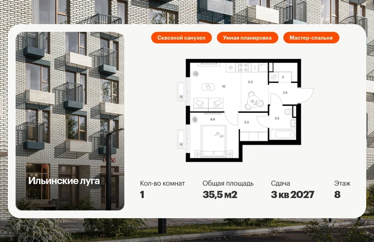 Продаётся 1-комн.квартира площадью 35.50 кв.м на 8 этаже 9 этажного дома (Корпус 4.3, секция 2) проекта ПИК Ильинские луга. Светлый просторный подъезд на уровне земли, функциональная планировка, большие окна, с отделкой. Жилой район «Ильинские луга» находится в 10 километрах от МКАД по Новорижскому шоссе, в 20 минутах на автомобиле от станций метро «Волоколамская», «Тушинская» и «Строгино». В будущем ближе к проекту, в 9 минутах пути на машине, откроется станция «Ильинская» Рублёво-Архангельской линии, которая будет соединять Арбатско-Покровскую линию и Большую кольцевую линию. «Ильинские луга» — масштабный проект, в который входит девять детских садов, четыре школы и поликлиника. Он строится в престижном и экологичном районе среди лесов и памятников природы. За 5 минут от жилого квартала можно доехать до Рублёво-Успенского шоссе, а за 30 минут — до центра Москвы. До крупного торгового центра «РИГАМОЛЛ» всего 5 минут на автомобиле, а до ТЦ «Твой дом» и гипермаркета «Глобус» — 10 минут. В «Ильинских лугах» строятся только девятиэтажные дома — такая архитектура соответствует спокойной жизни за городом. В каждом дворе-парке есть места для отдыха, детские и спортивные площадки. А ещё, здесь уже открыт большой PlayHub «Гравити» — современное игровое пространство с космической тематикой, холмами, зонами для игр и отдыха жителей любого возраста. На первых этажах уже работают магазины, кафе и пекарни. Места для отдыха от «Ильинских лугов» тоже недалеко: 10 минут на машине — и вы в музее-усадьбе «Архангельское». Также рядом находится Лохин остров — памятник природы, где водятся речные черепахи, есть места для кемпинга и возможность сплавиться по реке. Артикул - 1011957О застройщике