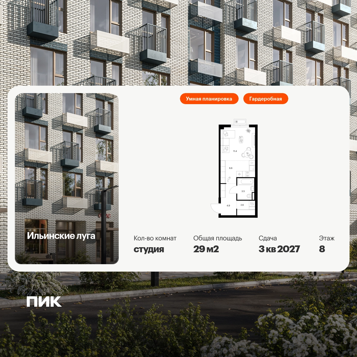 Продаётся квартира-студия площадью 29.00 кв.м на 8 этаже 9 этажного дома (Корпус 4.3, секция 4) проекта ПИК Ильинские луга. Светлый просторный подъезд на уровне земли, функциональная планировка, большие окна, с отделкой. Артикул - 1012176О застройщике