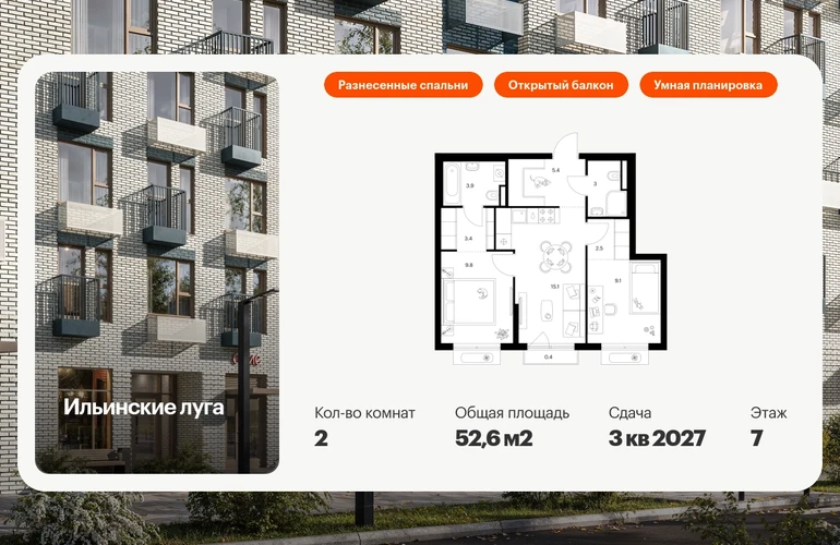 Продаётся 2-комн.квартира площадью 52.60 кв.м на 7 этаже 9 этажного дома (Корпус 4.3, секция 5) проекта ПИК Ильинские луга. Светлый просторный подъезд на уровне земли, функциональная планировка, большие окна, с отделкой. Жилой район «Ильинские луга» находится в 10 километрах от МКАД по Новорижскому шоссе, в 20 минутах на автомобиле от станций метро «Волоколамская», «Тушинская» и «Строгино». В будущем ближе к проекту, в 9 минутах пути на машине, откроется станция «Ильинская» Рублёво-Архангельской линии, которая будет соединять Арбатско-Покровскую линию и Большую кольцевую линию. «Ильинские луга» — масштабный проект, в который входит девять детских садов, четыре школы и поликлиника. Он строится в престижном и экологичном районе среди лесов и памятников природы. За 5 минут от жилого квартала можно доехать до Рублёво-Успенского шоссе, а за 30 минут — до центра Москвы. До крупного торгового центра «РИГАМОЛЛ» всего 5 минут на автомобиле, а до ТЦ «Твой дом» и гипермаркета «Глобус» — 10 минут. В «Ильинских лугах» строятся только девятиэтажные дома — такая архитектура соответствует спокойной жизни за городом. В каждом дворе-парке есть места для отдыха, детские и спортивные площадки. А ещё, здесь уже открыт большой PlayHub «Гравити» — современное игровое пространство с космической тематикой, холмами, зонами для игр и отдыха жителей любого возраста. На первых этажах уже работают магазины, кафе и пекарни. Места для отдыха от «Ильинских лугов» тоже недалеко: 10 минут на машине — и вы в музее-усадьбе «Архангельское». Также рядом находится Лохин остров — памятник природы, где водятся речные черепахи, есть места для кемпинга и возможность сплавиться по реке. Артикул - 1012281О застройщике