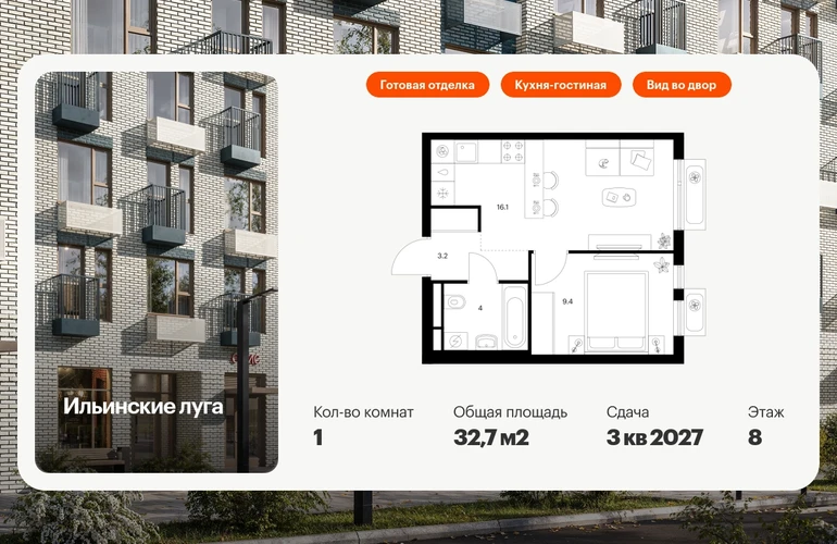 Продаётся 1-комн.квартира площадью 32.70 кв.м на 8 этаже 9 этажного дома (Корпус 3.4, секция 5) проекта ПИК Ильинские луга. Светлый просторный подъезд на уровне земли, функциональная планировка, большие окна, с отделкой. Жилой район «Ильинские луга» находится в 10 километрах от МКАД по Новорижскому шоссе, в 20 минутах на автомобиле от станций метро «Волоколамская», «Тушинская» и «Строгино». В будущем ближе к проекту, в 9 минутах пути на машине, откроется станция «Ильинская» Рублёво-Архангельской линии, которая будет соединять Арбатско-Покровскую линию и Большую кольцевую линию. «Ильинские луга» — масштабный проект, в который входит девять детских садов, четыре школы и поликлиника. Он строится в престижном и экологичном районе среди лесов и памятников природы. За 5 минут от жилого квартала можно доехать до Рублёво-Успенского шоссе, а за 30 минут — до центра Москвы. До крупного торгового центра «РИГАМОЛЛ» всего 5 минут на автомобиле, а до ТЦ «Твой дом» и гипермаркета «Глобус» — 10 минут. В «Ильинских лугах» строятся только девятиэтажные дома — такая архитектура соответствует спокойной жизни за городом. В каждом дворе-парке есть места для отдыха, детские и спортивные площадки. А ещё, здесь уже открыт большой PlayHub «Гравити» — современное игровое пространство с космической тематикой, холмами, зонами для игр и отдыха жителей любого возраста. На первых этажах уже работают магазины, кафе и пекарни. Места для отдыха от «Ильинских лугов» тоже недалеко: 10 минут на машине — и вы в музее-усадьбе «Архангельское». Также рядом находится Лохин остров — памятник природы, где водятся речные черепахи, есть места для кемпинга и возможность сплавиться по реке. Артикул - 995826О застройщике