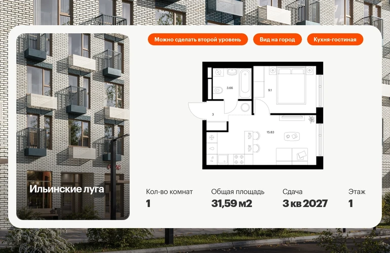 Продаётся 1-комн.квартира площадью 31.59 кв.м на 1 этаже 9 этажного дома (Корпус 3.2, секция 3) проекта ПИК Ильинские луга. Светлый просторный подъезд на уровне земли, функциональная планировка, большие окна, с отделкой. Жилой район «Ильинские луга» находится в 10 километрах от МКАД по Новорижскому шоссе, в 20 минутах на автомобиле от станций метро «Волоколамская», «Тушинская» и «Строгино». В будущем ближе к проекту, в 9 минутах пути на машине, откроется станция «Ильинская» Рублёво-Архангельской линии, которая будет соединять Арбатско-Покровскую линию и Большую кольцевую линию. «Ильинские луга» — масштабный проект, в который входит девять детских садов, четыре школы и поликлиника. Он строится в престижном и экологичном районе среди лесов и памятников природы. За 5 минут от жилого квартала можно доехать до Рублёво-Успенского шоссе, а за 30 минут — до центра Москвы. До крупного торгового центра «РИГАМОЛЛ» всего 5 минут на автомобиле, а до ТЦ «Твой дом» и гипермаркета «Глобус» — 10 минут. В «Ильинских лугах» строятся только девятиэтажные дома — такая архитектура соответствует спокойной жизни за городом. В каждом дворе-парке есть места для отдыха, детские и спортивные площадки. А ещё, здесь уже открыт большой PlayHub «Гравити» — современное игровое пространство с космической тематикой, холмами, зонами для игр и отдыха жителей любого возраста. На первых этажах уже работают магазины, кафе и пекарни. Места для отдыха от «Ильинских лугов» тоже недалеко: 10 минут на машине — и вы в музее-усадьбе «Архангельское». Также рядом находится Лохин остров — памятник природы, где водятся речные черепахи, есть места для кемпинга и возможность сплавиться по реке. Артикул - 999730О застройщике