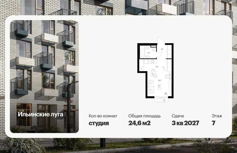 Продаётся квартира-студия площадью 24.60 кв.м на 7 этаже 9 этажного дома (Корпус 4.3, секция 2) проекта ПИК Ильинские луга. Светлый просторный подъезд на уровне земли, функциональная планировка, большие окна, с отделкой. Жилой район «Ильинские луга» находится в 10 километрах от МКАД по Новорижскому шоссе, в 20 минутах на автомобиле от станций метро «Волоколамская», «Тушинская» и «Строгино». В будущем ближе к проекту, в 9 минутах пути на машине, откроется станция «Ильинская» Рублёво-Архангельской линии, которая будет соединять Арбатско-Покровскую линию и Большую кольцевую линию. «Ильинские луга» — масштабный проект, в который входит девять детских садов, четыре школы и поликлиника. Он строится в престижном и экологичном районе среди лесов и памятников природы. За 5 минут от жилого квартала можно доехать до Рублёво-Успенского шоссе, а за 30 минут — до центра Москвы. До крупного торгового центра «РИГАМОЛЛ» всего 5 минут на автомобиле, а до ТЦ «Твой дом» и гипермаркета «Глобус» — 10 минут. В «Ильинских лугах» строятся только девятиэтажные дома — такая архитектура соответствует спокойной жизни за городом. В каждом дворе-парке есть места для отдыха, детские и спортивные площадки. А ещё, здесь уже открыт большой PlayHub «Гравити» — современное игровое пространство с космической тематикой, холмами, зонами для игр и отдыха жителей любого возраста. На первых этажах уже работают магазины, кафе и пекарни. Места для отдыха от «Ильинских лугов» тоже недалеко: 10 минут на машине — и вы в музее-усадьбе «Архангельское». Также рядом находится Лохин остров — памятник природы, где водятся речные черепахи, есть места для кемпинга и возможность сплавиться по реке. Артикул - 1011941О застройщике
