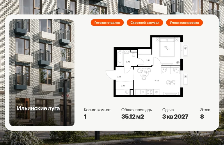 Продаётся 1-комн.квартира площадью 35.12 кв.м на 8 этаже 9 этажного дома (Корпус 4.1, секция 2) проекта ПИК Ильинские луга. Светлый просторный подъезд на уровне земли, функциональная планировка, большие окна, с отделкой. Жилой район «Ильинские луга» находится в 10 километрах от МКАД по Новорижскому шоссе, в 20 минутах на автомобиле от станций метро «Волоколамская», «Тушинская» и «Строгино». В будущем ближе к проекту, в 9 минутах пути на машине, откроется станция «Ильинская» Рублёво-Архангельской линии, которая будет соединять Арбатско-Покровскую линию и Большую кольцевую линию. «Ильинские луга» — масштабный проект, в который входит девять детских садов, четыре школы и поликлиника. Он строится в престижном и экологичном районе среди лесов и памятников природы. За 5 минут от жилого квартала можно доехать до Рублёво-Успенского шоссе, а за 30 минут — до центра Москвы. До крупного торгового центра «РИГАМОЛЛ» всего 5 минут на автомобиле, а до ТЦ «Твой дом» и гипермаркета «Глобус» — 10 минут. В «Ильинских лугах» строятся только девятиэтажные дома — такая архитектура соответствует спокойной жизни за городом. В каждом дворе-парке есть места для отдыха, детские и спортивные площадки. А ещё, здесь уже открыт большой PlayHub «Гравити» — современное игровое пространство с космической тематикой, холмами, зонами для игр и отдыха жителей любого возраста. На первых этажах уже работают магазины, кафе и пекарни. Места для отдыха от «Ильинских лугов» тоже недалеко: 10 минут на машине — и вы в музее-усадьбе «Архангельское». Также рядом находится Лохин остров — памятник природы, где водятся речные черепахи, есть места для кемпинга и возможность сплавиться по реке. Артикул - 1015888О застройщике
