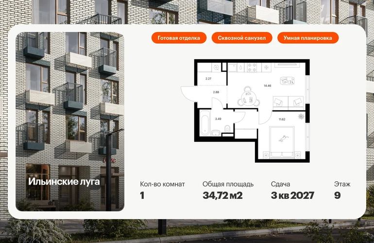 Продаётся 1-комн.квартира площадью 34.72 кв.м на 9 этаже 9 этажного дома (Корпус 4.1, секция 4) проекта ПИК Ильинские луга. Светлый просторный подъезд на уровне земли, функциональная планировка, большие окна, с отделкой. Жилой район «Ильинские луга» находится в 10 километрах от МКАД по Новорижскому шоссе, в 20 минутах на автомобиле от станций метро «Волоколамская», «Тушинская» и «Строгино». В будущем ближе к проекту, в 9 минутах пути на машине, откроется станция «Ильинская» Рублёво-Архангельской линии, которая будет соединять Арбатско-Покровскую линию и Большую кольцевую линию. «Ильинские луга» — масштабный проект, в который входит девять детских садов, четыре школы и поликлиника. Он строится в престижном и экологичном районе среди лесов и памятников природы. За 5 минут от жилого квартала можно доехать до Рублёво-Успенского шоссе, а за 30 минут — до центра Москвы. До крупного торгового центра «РИГАМОЛЛ» всего 5 минут на автомобиле, а до ТЦ «Твой дом» и гипермаркета «Глобус» — 10 минут. В «Ильинских лугах» строятся только девятиэтажные дома — такая архитектура соответствует спокойной жизни за городом. В каждом дворе-парке есть места для отдыха, детские и спортивные площадки. А ещё, здесь уже открыт большой PlayHub «Гравити» — современное игровое пространство с космической тематикой, холмами, зонами для игр и отдыха жителей любого возраста. На первых этажах уже работают магазины, кафе и пекарни. Места для отдыха от «Ильинских лугов» тоже недалеко: 10 минут на машине — и вы в музее-усадьбе «Архангельское». Также рядом находится Лохин остров — памятник природы, где водятся речные черепахи, есть места для кемпинга и возможность сплавиться по реке. Артикул - 1016132О застройщике