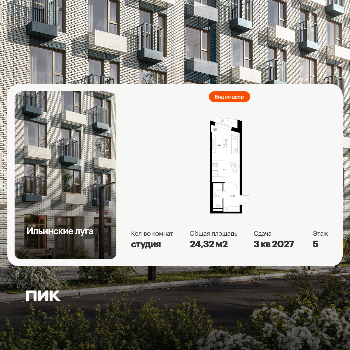 Продаётся квартира-студия площадью 24.32 кв.м на 5 этаже 9 этажного дома (Корпус 4.2, секция 5) проекта ПИК Ильинские луга. Светлый просторный подъезд на уровне земли, функциональная планировка, большие окна, с отделкой. Жилой район «Ильинские луга» находится в 10 километрах от МКАД по Новорижскому шоссе, в 20 минутах на автомобиле от станций метро «Волоколамская», «Тушинская» и «Строгино». В будущем ближе к проекту, в 9 минутах пути на машине, откроется станция «Ильинская» Рублёво-Архангельской линии, которая будет соединять Арбатско-Покровскую линию и Большую кольцевую линию. «Ильинские луга» — масштабный проект, в который входит девять детских садов, четыре школы и поликлиника. Он строится в престижном и экологичном районе среди лесов и памятников природы. За 5 минут от жилого квартала можно доехать до Рублёво-Успенского шоссе, а за 30 минут — до центра Москвы. До крупного торгового центра «РИГАМОЛЛ» всего 5 минут на автомобиле, а до ТЦ «Твой дом» и гипермаркета «Глобус» — 10 минут. В «Ильинских лугах» строятся только девятиэтажные дома — такая архитектура соответствует спокойной жизни за городом. В каждом дворе-парке есть места для отдыха, детские и спортивные площадки. А ещё, здесь уже открыт большой PlayHub «Гравити» — современное игровое пространство с космической тематикой, холмами, зонами для игр и отдыха жителей любого возраста. На первых этажах уже работают магазины, кафе и пекарни. Места для отдыха от «Ильинских лугов» тоже недалеко: 10 минут на машине — и вы в музее-усадьбе «Архангельское». Также рядом находится Лохин остров — памятник природы, где водятся речные черепахи, есть места для кемпинга и возможность сплавиться по реке. Артикул - 1015613О застройщике