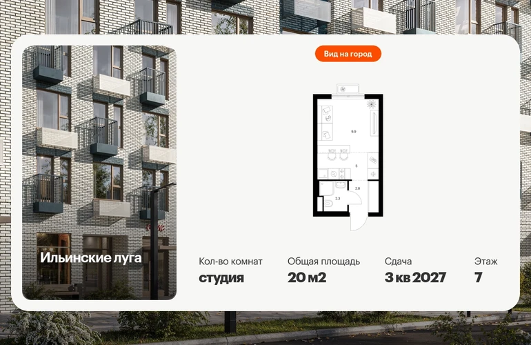 Продаётся квартира-студия площадью 20.00 кв.м на 7 этаже 9 этажного дома (Корпус 3.1, секция 1) проекта ПИК Ильинские луга. Светлый просторный подъезд на уровне земли, функциональная планировка, большие окна, с отделкой. Жилой район «Ильинские луга» находится в 10 километрах от МКАД по Новорижскому шоссе, в 20 минутах на автомобиле от станций метро «Волоколамская», «Тушинская» и «Строгино». В будущем ближе к проекту, в 9 минутах пути на машине, откроется станция «Ильинская» Рублёво-Архангельской линии, которая будет соединять Арбатско-Покровскую линию и Большую кольцевую линию. «Ильинские луга» — масштабный проект, в который входит девять детских садов, четыре школы и поликлиника. Он строится в престижном и экологичном районе среди лесов и памятников природы. За 5 минут от жилого квартала можно доехать до Рублёво-Успенского шоссе, а за 30 минут — до центра Москвы. До крупного торгового центра «РИГАМОЛЛ» всего 5 минут на автомобиле, а до ТЦ «Твой дом» и гипермаркета «Глобус» — 10 минут. В «Ильинских лугах» строятся только девятиэтажные дома — такая архитектура соответствует спокойной жизни за городом. В каждом дворе-парке есть места для отдыха, детские и спортивные площадки. А ещё, здесь уже открыт большой PlayHub «Гравити» — современное игровое пространство с космической тематикой, холмами, зонами для игр и отдыха жителей любого возраста. На первых этажах уже работают магазины, кафе и пекарни. Места для отдыха от «Ильинских лугов» тоже недалеко: 10 минут на машине — и вы в музее-усадьбе «Архангельское». Также рядом находится Лохин остров — памятник природы, где водятся речные черепахи, есть места для кемпинга и возможность сплавиться по реке. Артикул - 1001314О застройщике