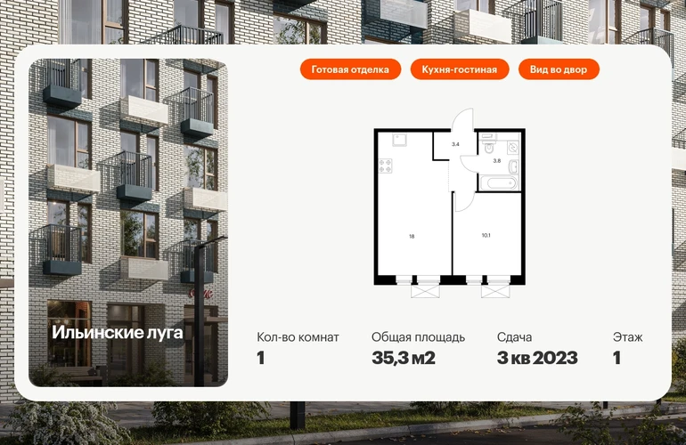 Продаётся 1-комн.квартира площадью 35.30 кв.м на 1 этаже 9 этажного дома (Корпус 8, секция 5) проекта ПИК Ильинские луга. Светлый просторный подъезд на уровне земли, функциональная планировка, большие окна. Жилой район «Ильинские луга» находится в 10 километрах от МКАД по Новорижскому шоссе, в 20 минутах на автомобиле от станций метро «Волоколамская», «Тушинская» и «Строгино». В будущем ближе к проекту, в 9 минутах пути на машине, откроется станция «Ильинская» Рублёво-Архангельской линии, которая будет соединять Арбатско-Покровскую линию и Большую кольцевую линию. «Ильинские луга» — масштабный проект, в который входит девять детских садов, четыре школы и поликлиника. Он строится в престижном и экологичном районе среди лесов и памятников природы. За 5 минут от жилого квартала можно доехать до Рублёво-Успенского шоссе, а за 30 минут — до центра Москвы. До крупного торгового центра «РИГАМОЛЛ» всего 5 минут на автомобиле, а до ТЦ «Твой дом» и гипермаркета «Глобус» — 10 минут. В «Ильинских лугах» строятся только девятиэтажные дома — такая архитектура соответствует спокойной жизни за городом. В каждом дворе-парке есть места для отдыха, детские и спортивные площадки. А ещё, здесь уже открыт большой PlayHub «Гравити» — современное игровое пространство с космической тематикой, холмами, зонами для игр и отдыха жителей любого возраста. На первых этажах уже работают магазины, кафе и пекарни. Места для отдыха от «Ильинских лугов» тоже недалеко: 10 минут на машине — и вы в музее-усадьбе «Архангельское». Также рядом находится Лохин остров — памятник природы, где водятся речные черепахи, есть места для кемпинга и возможность сплавиться по реке. Артикул - 773389О застройщике