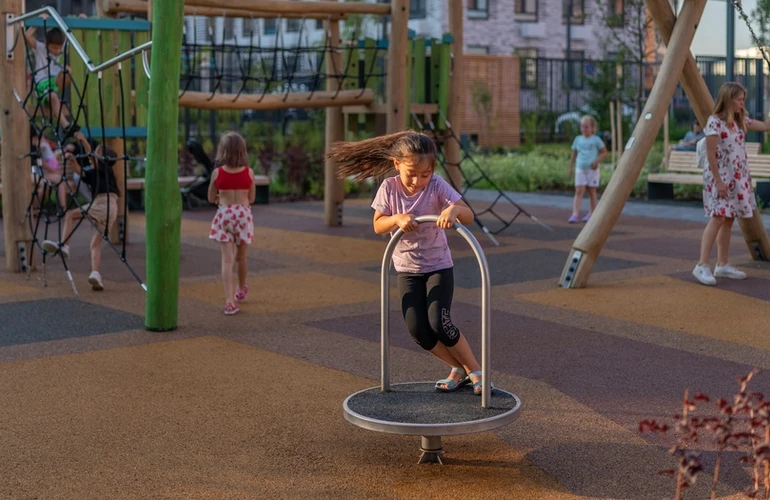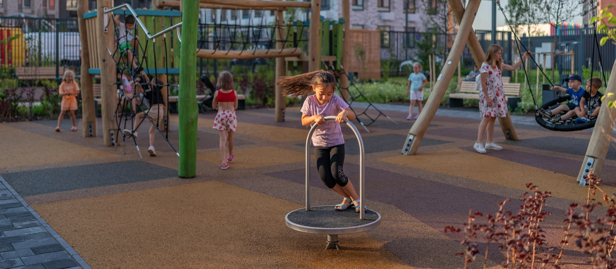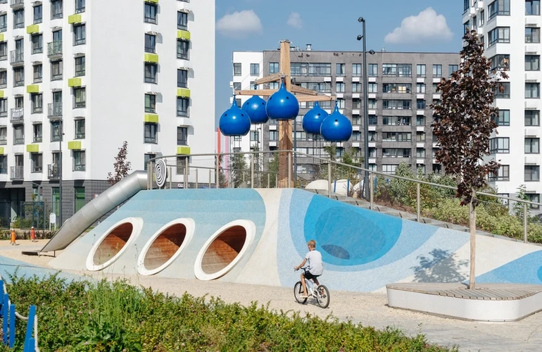 Чтобы дети как можно больше времени проводили на улице, мы придумали особый формат игровых площадок — PlayHub. Каждая из них с уникальным ландшафтом и игровыми плотинами на искусственном ручье. А благодаря абстрактным формам игрового оборудования дети могут придумать бесконечное количество игр.