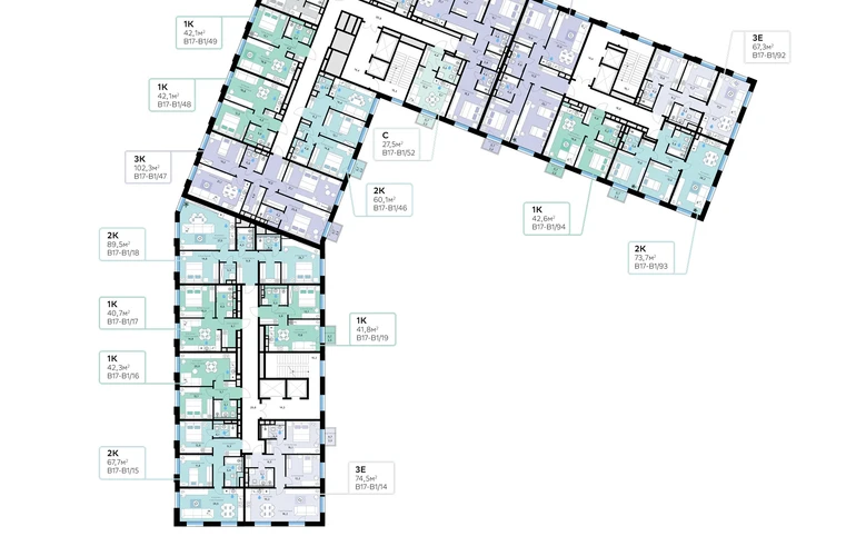 Квартал В17 состоит из шести корпусов переменной этажности (от 1 до 10 этажей) и 491 квартиры. Корпуса объединены общей подземной частью, где расположен паркинг на 309 автомобилей, места для мотоциклов и более 400 кладовых помещений.