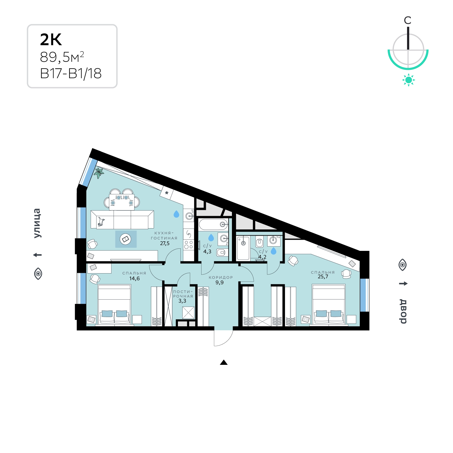 В продаже — двухкомнатная квартира с чистовой отделкой, общей площадью 89,5 кв. м. Квартира расположена на четвертом этаже шестиэтажного корпуса класса Балансд в квартале В17 нового района СберСити, который строит Сбер. Всего в доме — 102 квартиры.Архитектуру корпусов квартала разработало итальянское бюро. В облике В17 читаются черты современной голландской архитектуры: фасады домов класса Балансд облицованы ярким кирпичом и клинкерной плиткой, над первым этажом проходит декоративный пояс из фигурной кладки. Французские балкончики чередуются с широкими окнами, создавая гармоничный ритм. Во дворах — ландшафтные композиции, детские и спортивные площадки, зона для йоги, прогулочные дорожки и места отдыха. Рядом расположены детский сад, парк и набережная Москвы-реки.