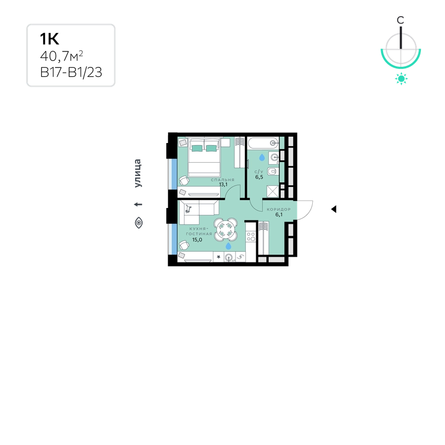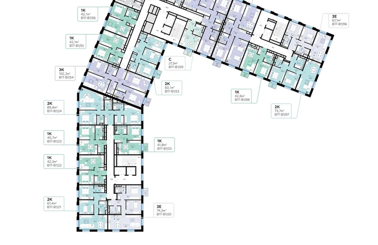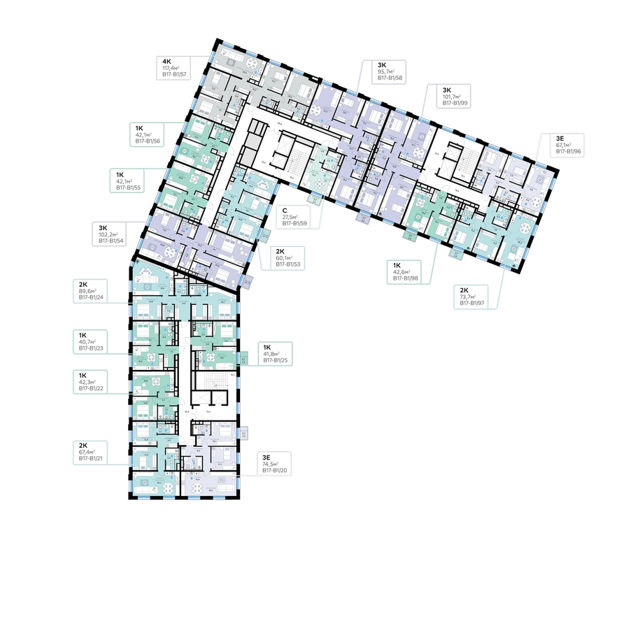 Квартал В17 состоит из шести корпусов переменной этажности (1, 2, 5-10 этажей), в которых размещается 491 квартира. Выдача ключей жителям запланирована на декабрь 2026 года. Корпуса объединены общей подземной частью, в которой располагается паркинг на 309 автомобилей, места для мотоциклов, а также более 400 кладовых для жильцов.