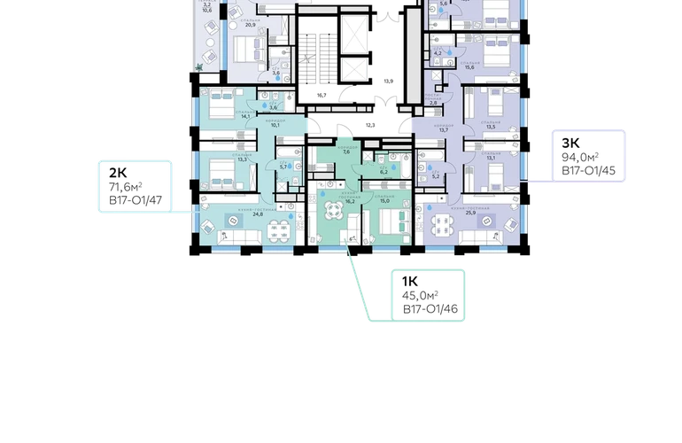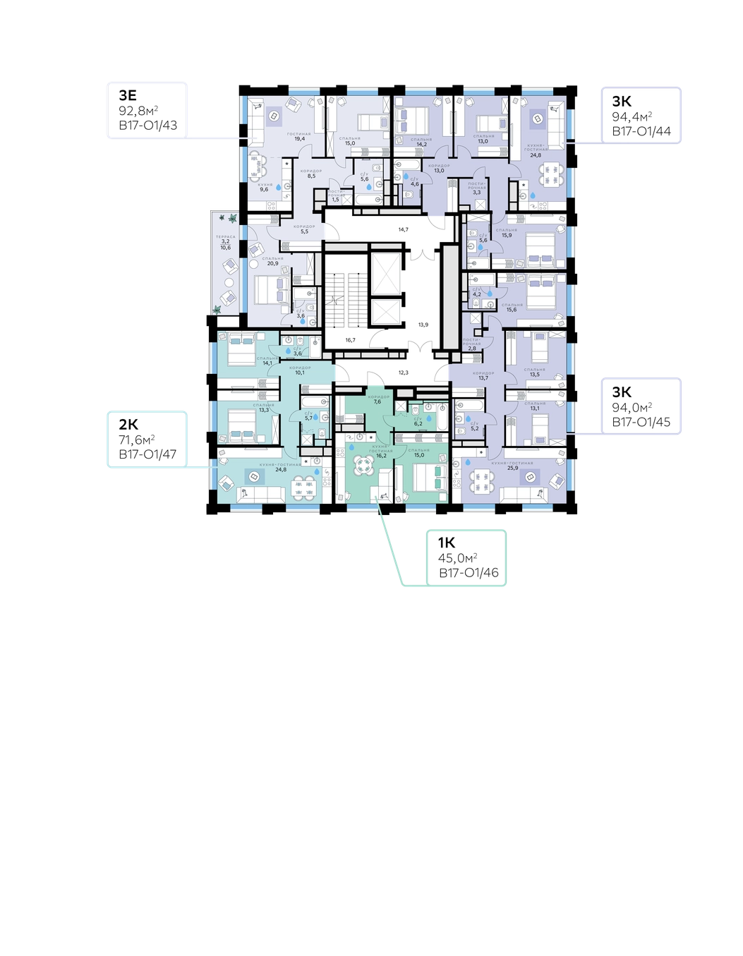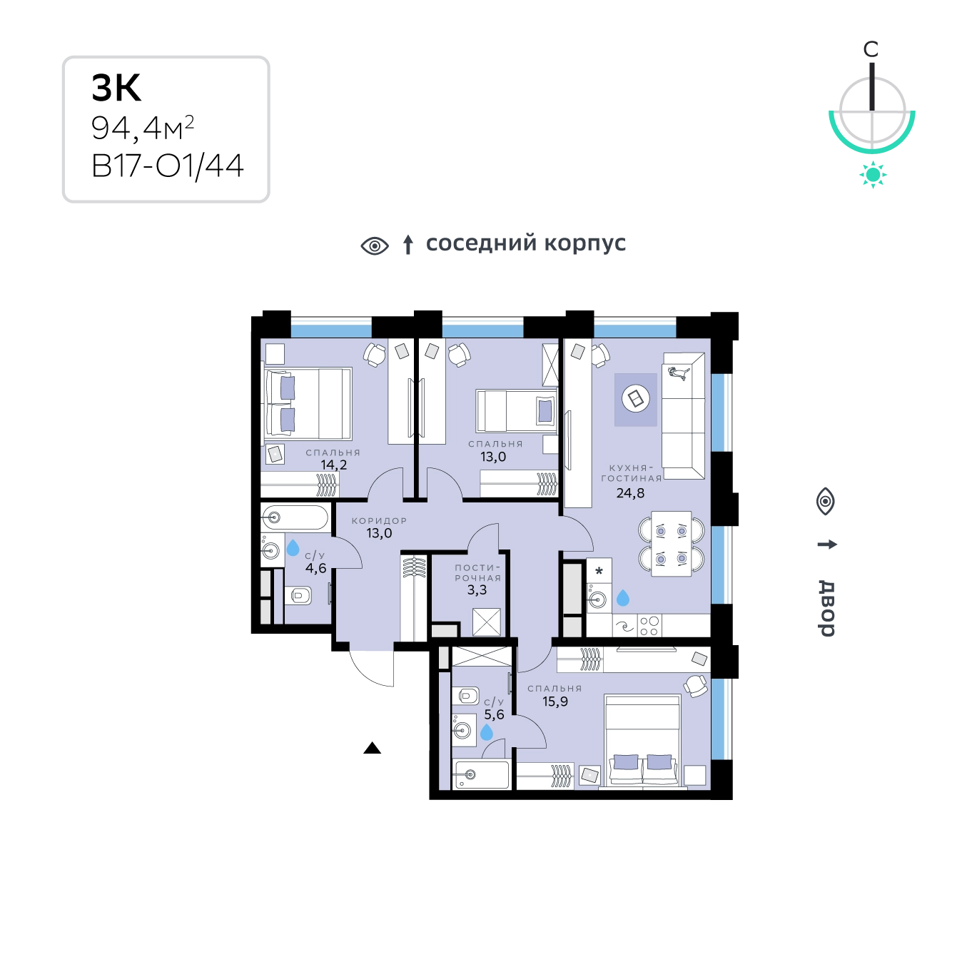 В продаже 3к квартира общей площадью 94,4кв. м. Квартира расположена на 8 этаже 10-этажного дома класса Optimum в новом Рублёво-Архангельском районе Москвы, который строит Сбер. Всего в доме 55 квартир.Квартал В17 – это современная интерпретация голландской архитектуры, каждый корпус имеет свой особый облик. В домах класса Optimum используется лаконичная крупноформатная облицовка стеклофибробетоном и декоративными металлическими панелями. На верхних этажах домов располагаются квартиры с панорамным остеклением и террасами, с которых открывается вид на город, парки и бульвар.