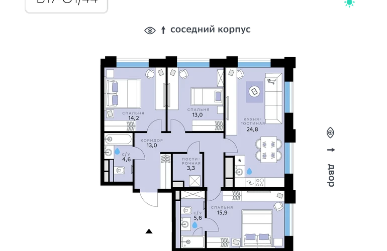 Квартал В17 состоит из шести корпусов переменной этажности (1, 2, 5-10 этажей), в которых размещается 491 квартира. Выдача ключей жителям запланирована на декабрь 2026 года. Корпуса объединены общей подземной частью, в которой располагается паркинг на 309 автомобилей, места для мотоциклов, а также более 400 кладовых для жильцов.