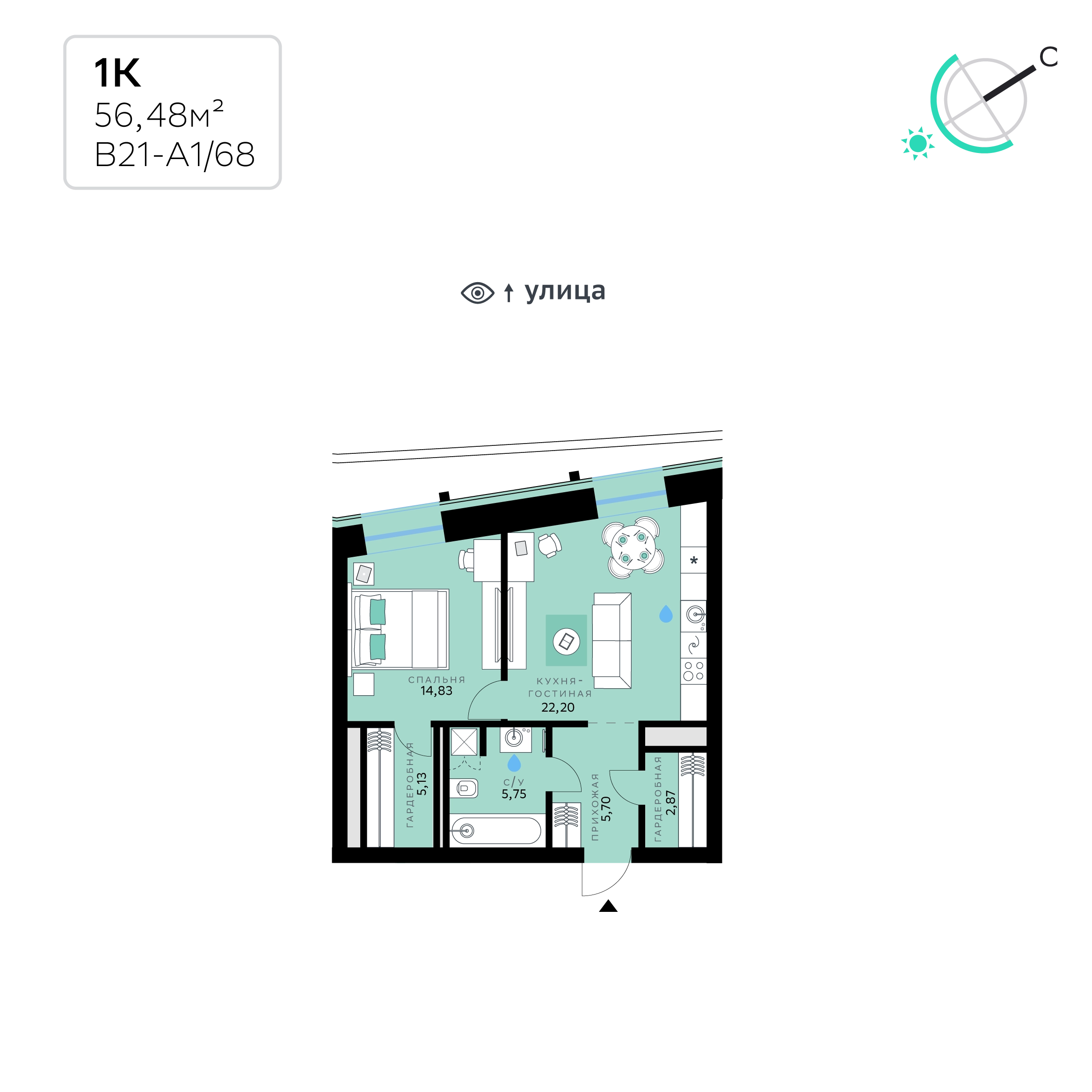 В продаже — однокомнатная квартира с чистовой отделкой, общей площадью 56,48 кв. м. Квартира расположена на четвертом этаже тринадцатиэтажной секции корпуса класса Адвансд в новом районе СберСити, который строит Сбер. Дом находится на второй береговой линии Москвы-реки.Сочетание элегантной архитектуры от ведущего итальянского бюро и передовых технологий на всех уровнях — от квартиры до инфраструктуры района. Отделка фасадов корпуса класса Адвансд выполнена из природного камня, глазурованной плитки и алюминия.