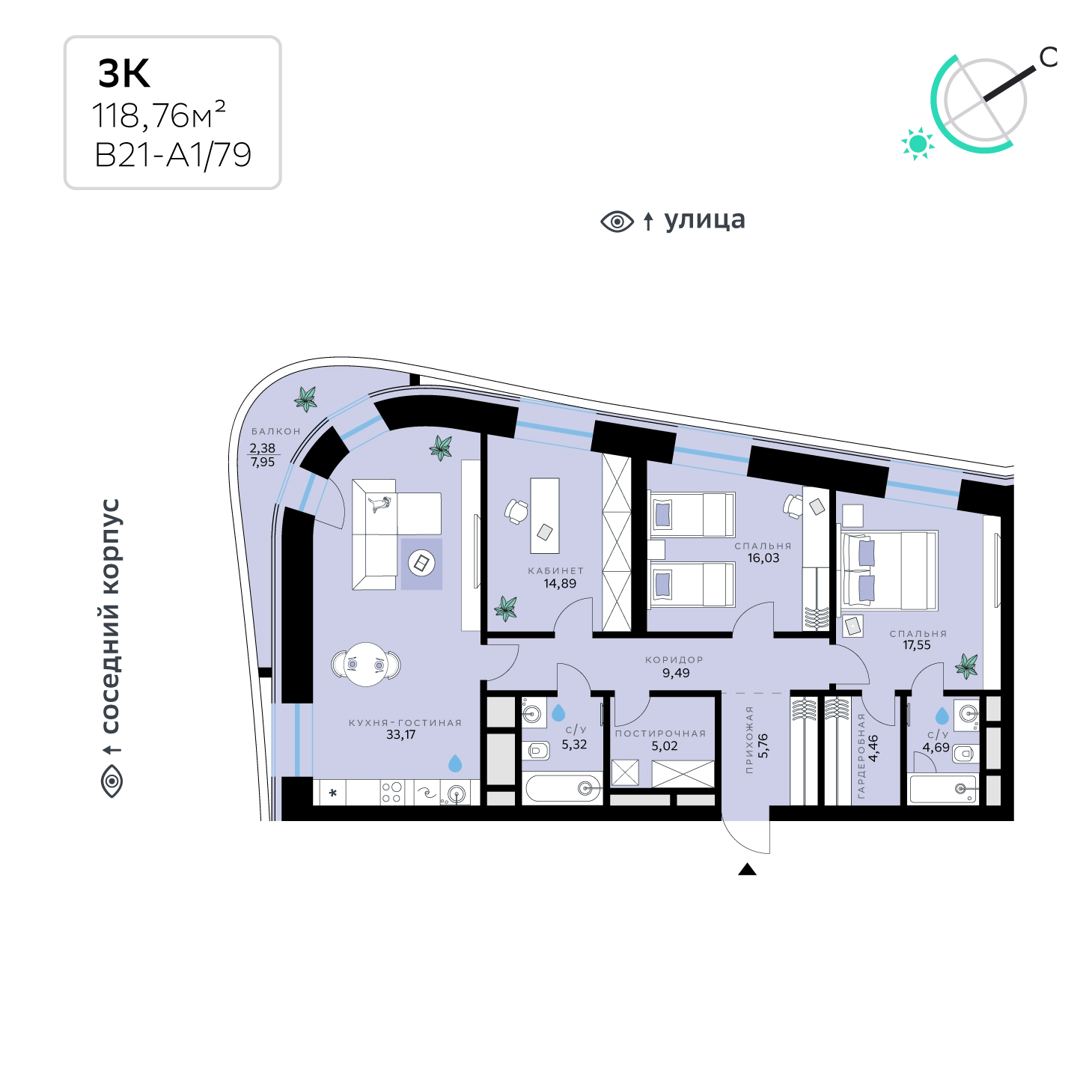 В продаже — трехкомнатная квартира с чистовой отделкой, общей площадью 118,76 кв. м. Квартира расположена на пятом этаже тринадцатиэтажной секции корпуса класса Адвансд в новом районе СберСити, который строит Сбер. Дом находится на второй береговой линии Москвы-реки.Сочетание элегантной архитектуры от ведущего итальянского бюро и передовых технологий на всех уровнях — от квартиры до инфраструктуры района. Отделка фасадов корпуса класса Адвансд выполнена из природного камня, глазурованной плитки и алюминия.