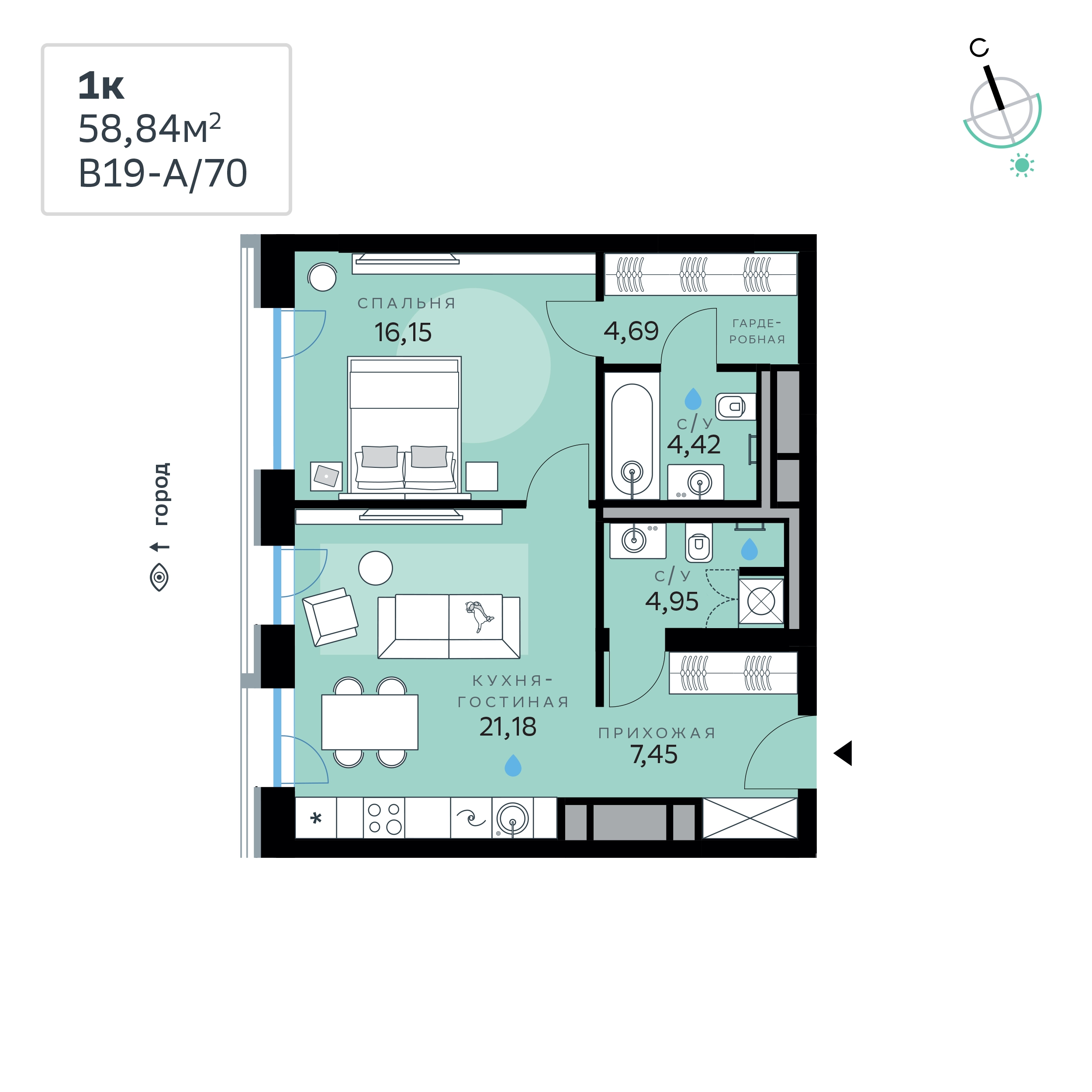 В продаже — однокомнатная квартира, общей площадью 58,84 кв. м. Квартира расположена на третьем этаже двенадцатиэтажной секции корпуса класса Адвансд в новом районе СберСити, который строит Сбер. Дом находится на второй береговой линии Москвы-реки.Отделка фасадов корпуса класса Адвансд выполнена из природного камня, глазурованной плитки и алюминия. Дом возводится по технологии монолитного строительства. В квартире проведены работы по улучшению шумоизоляции, установлены двухкамерные стеклопакеты с низкоэмиссионными стёклами, минимизирующими теплопотери. Высота окон — от 3 до 3,25 м. Квартира сдаётся без отделки. Высота потолков — от 3,3 до 3,5 м.